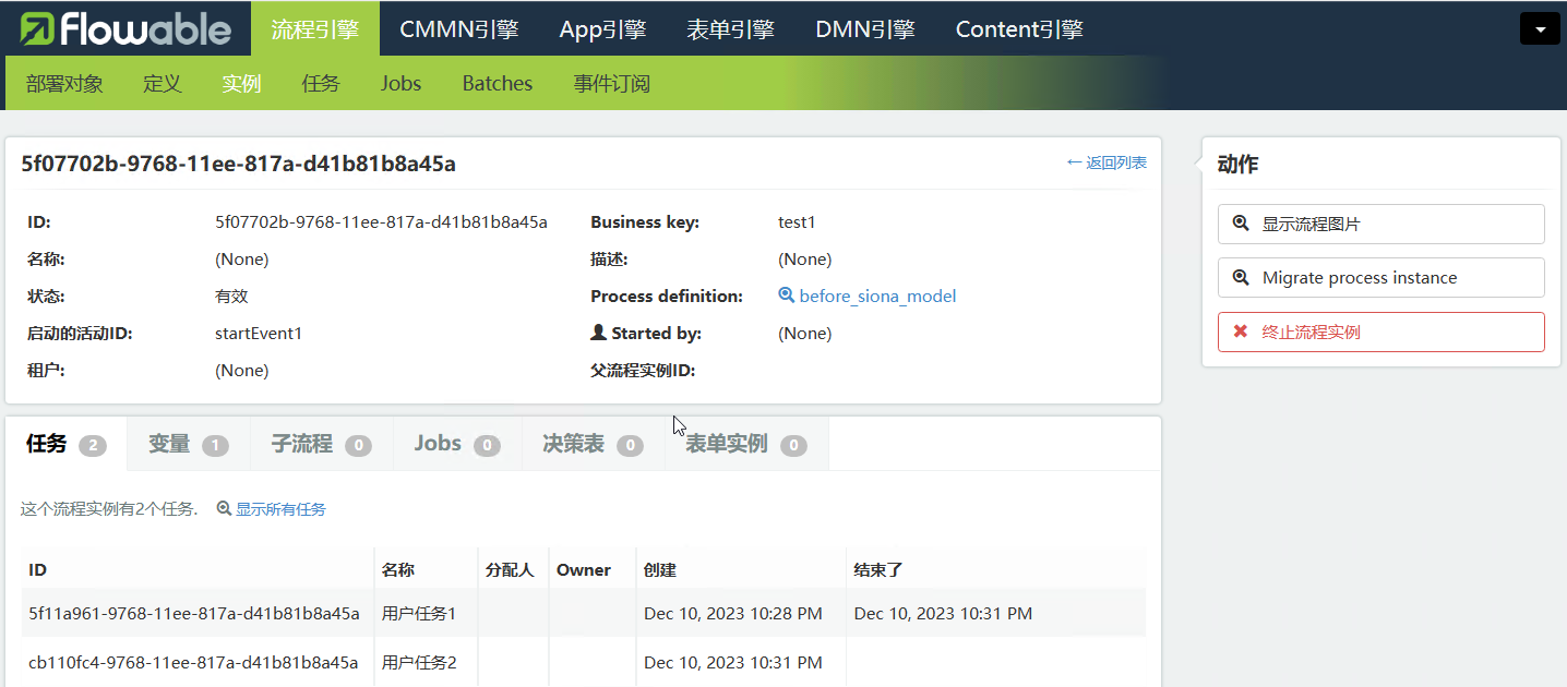 (5)完成 “用户任务2”(此时,流程实例为 instance1,流程模型 v1,不会执行新版本的流程,需要迁移流程‼️)